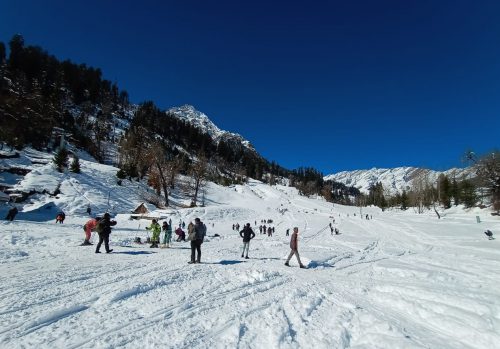 - मनाली के सोलंगनाला में शुक्रवार को स्कीइंग करते सैलानी.