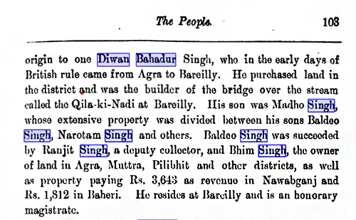 गज़ेटियर कहता है कि दीवान बहादुर सिंह, ब्रिटिश शासनकाल के शुरुआती दिनों में आगरा से बरेली आए थे. यहाँ उन्होंने कई जगह ज़मीनें ख़रीदी और बरेली में क़िला की नदी पर पुल बनवाया. उनके बेटे माधो सिंह थे, जिनकी बड़ी जायदाद उनके बेटों बलदेव सिंह, नरोत्तम सिंह और अन्य के बीच बँट गई. बलदेव सिंह के उत्तराधिकारी रंजीत सिंह और भीम सिंह थे. रंजीत डिप्टी कलेक्टर हुए, और भीम सिंह आगरा, मथुरा, पीलीभीत और अन्य ज़िलों में ज़मीनों के मालिक थे, उनके पास नवाबगंज और बहेड़ी ने भी ज़मीनें थीं. वह बरेली में रहते हैं और मानद मजिस्ट्रेट हैं. (पेज 103)